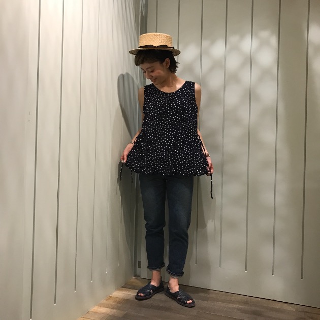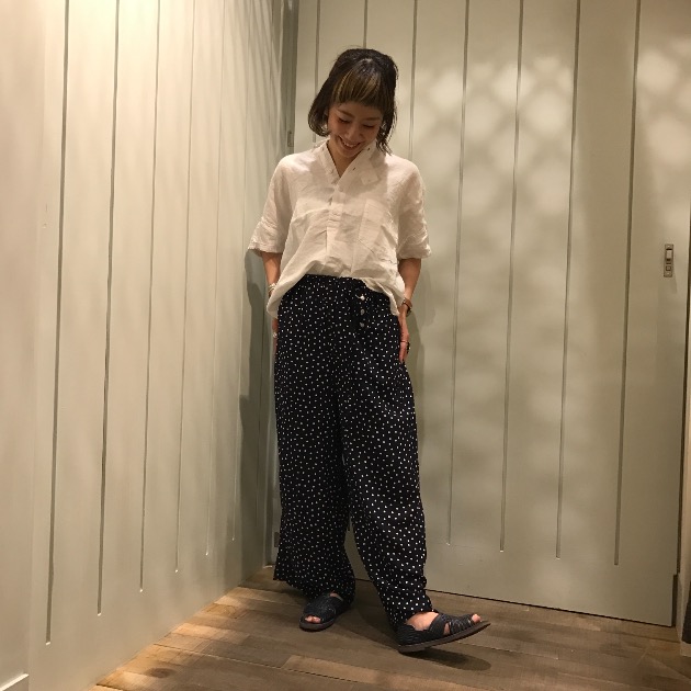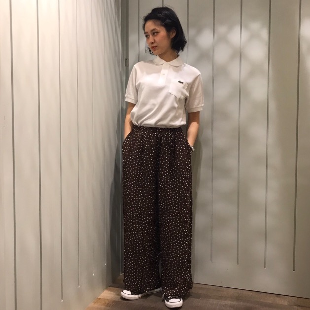 ポロシャツに太いパンツとかなりメンズライクですが、パンツの小さいドット柄で女の子らしさを。