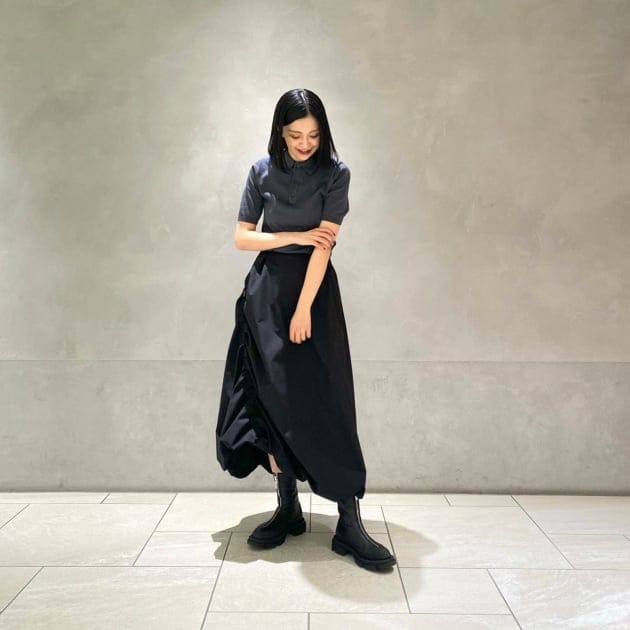 シックな印象のチャコールグレーは、形が特徴的なバルーンスカートと合わせてシンプルになり過ぎずコーディネートしています。
