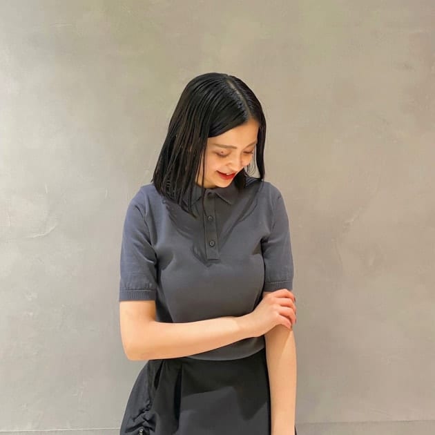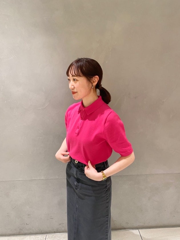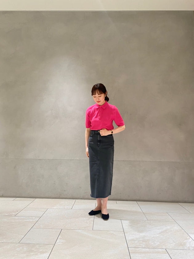 きれいめな印象のポロニットもデニムスカートと合わせてカジュアルダウンすると、また少し違った雰囲気でお楽しみ頂けます!
