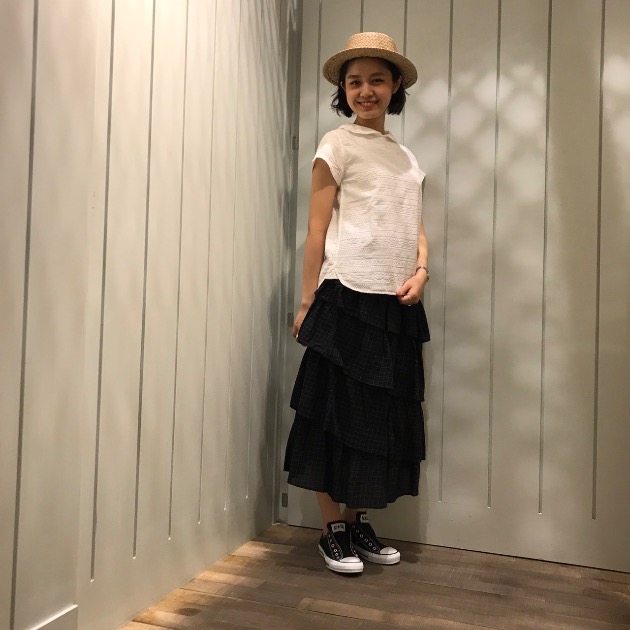 ロングスカートを合わせ女の子らしいスタイルに。