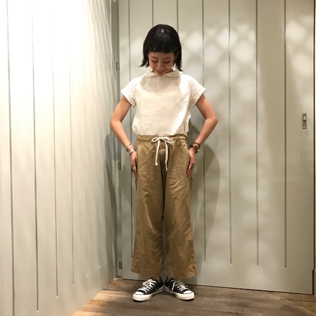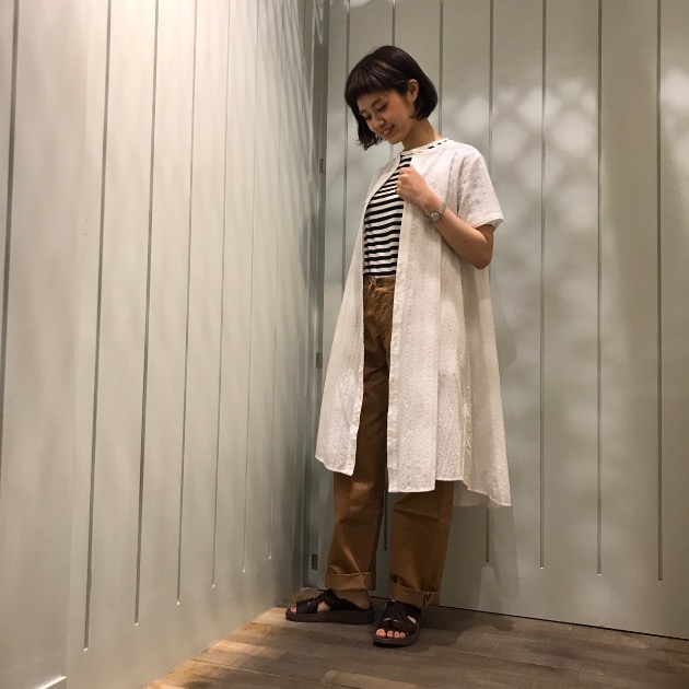 女の子らしい形素材ですが、メンズライクのアイテムとも相性抜群!