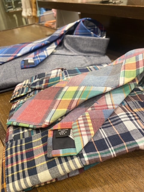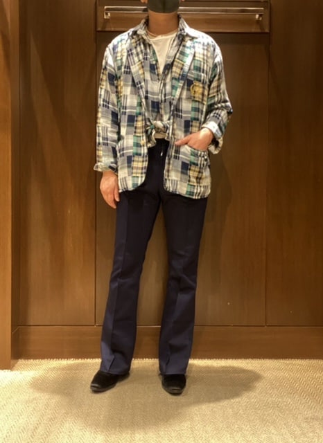自分としてはこのリラックスした80年代の空気感にも通じるオーバーサイズジャケットにフレアパンツシルエットとブーツの70年代のバランスが新鮮です。フレアなので正攻法としてはジャケットは構築的なショルダーラインの縦に着丈の長いサンローランテイストなんでしょうが、そこは天邪鬼なので許して下さい。しかもアメトラテイスト満点のパッチワークマドラス生地とかパイピング始末とかエンブレム刺繍とか。とにかく皆さんも感じてるとは思いますがマドラスチェックとかタータンチェックとかもよりアメリカ的なムードにやたらと再注目しちゃう気分ですよね。フレンチトラッド再燃もあるのでリンクするのも当然と言えば当然なんですが。