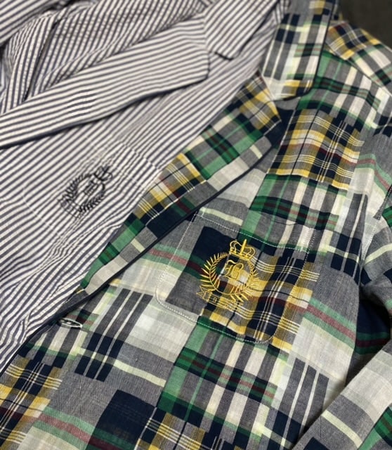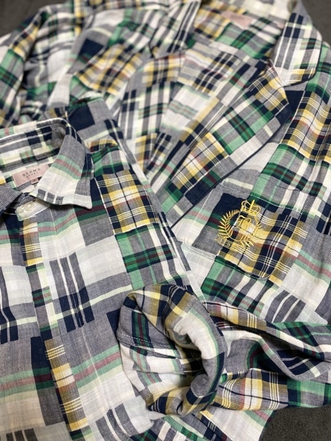 パッチワークマドラスのビッグシルエットレギュラーシャツにパイピングリラックスシルエットシャツジャケット。金のエンブレム刺繍まで胸に付いてます。癖があるのに更に重ねてアンサンブルで着るというくどい合わせ。その当時全く日の目は出ずにひっそりと売られてましたが自分的には相当に冴えてた企画の筈。