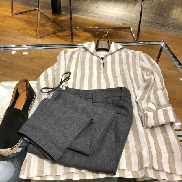 リネンシャツを合わせて上下リネンのスタイリングです。
