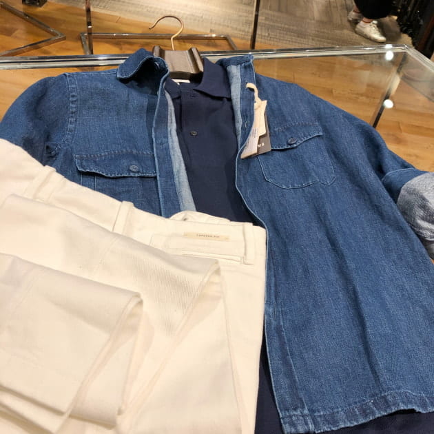 ジャケットスタイルでももちろん合いますが、今回はデニムのワークシャツにポロシャツを合わせました。