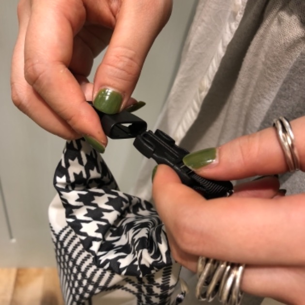 帯留めを通常の傘よりも上位置につけることで、たたんだ時にスマートに見えるよう工夫しています。
