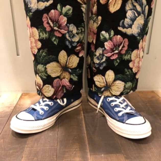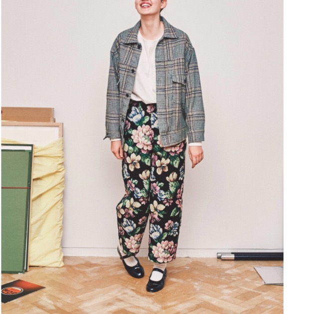 形はワークテイストのパンツですが、生地にはイタリア製のジャガードを使用し、とびきりロマンチックに。