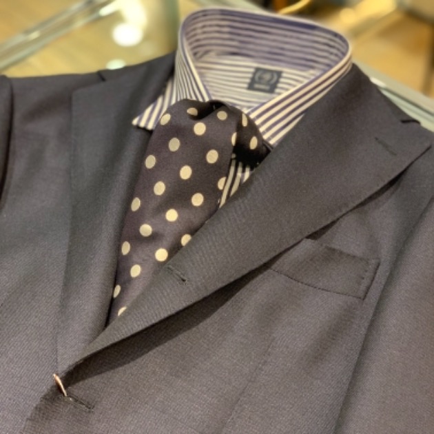 ソリッドでありながらも主張の強いスーツですので、Vゾーンはストライプシャツにドットタイでいかがでしょう。チーフはリネンの白ですね。