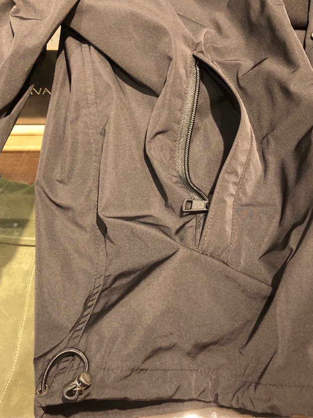 フロントジップの配置がアシンメトリーだったり、右脇シームにも隠しポケットが配されるなど洗練されたデザインに注目です。