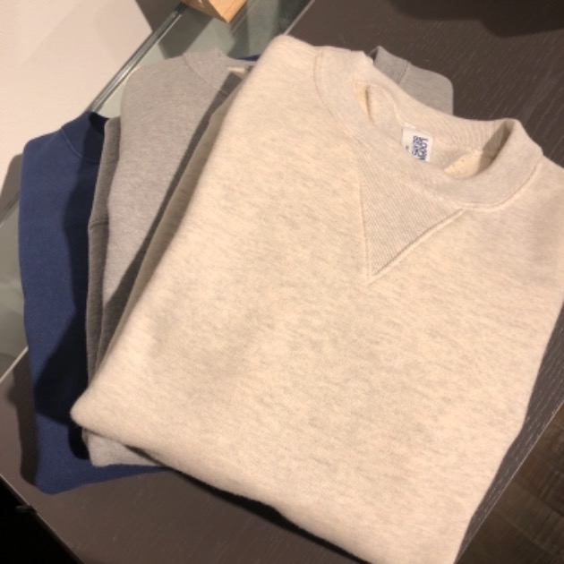 今までのスリムスウェットはボタンダウンシャツの上から着ることを想定していた為、ネックが少し浮いた作りになっていました。