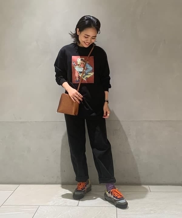 スタイリッシュな雰囲気の中にプリントのロンTや印象的なスニーカーで遊び心もプラスしています!ここでレザーのバックをプラスすることにより一気に大人っぽい印象に!!