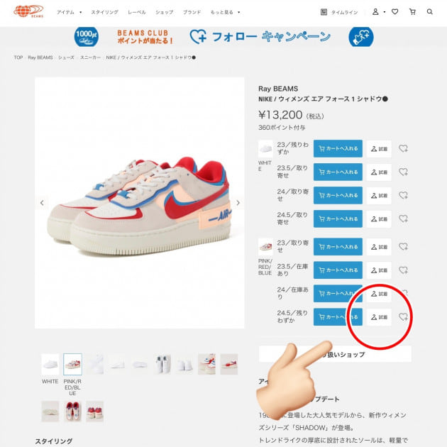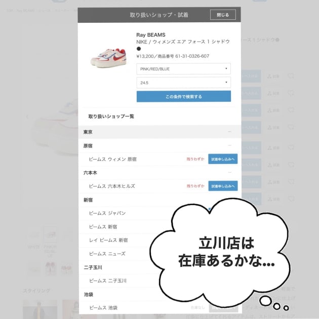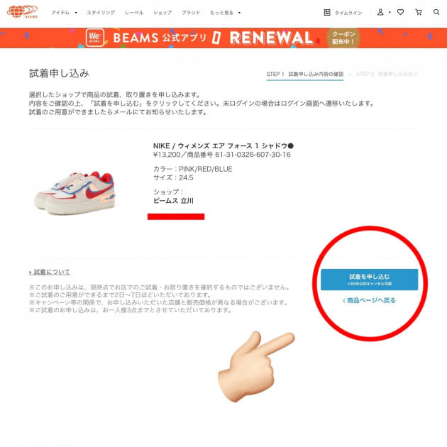 希望の店舗に在庫がありましたら、最後に【試着を申込む】で完了となります。その後は、BEAMSからのメールをお待ちください♪