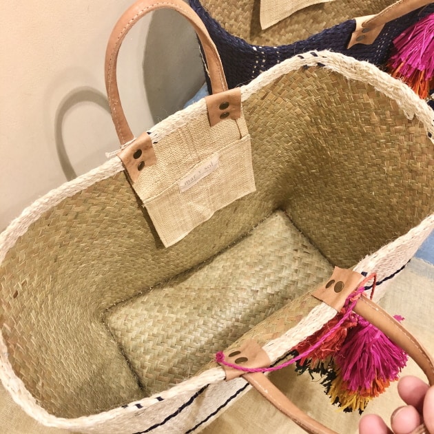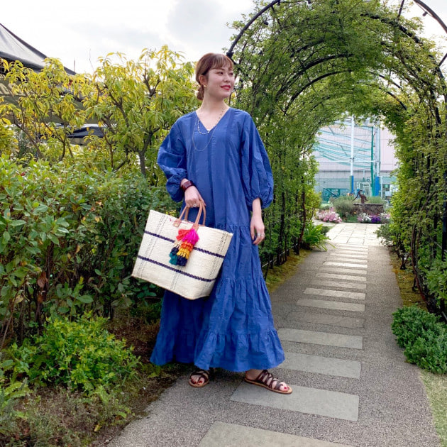 合わせているのは<Mar Y Sol(マリソル)>の大型トートバッグ!!NYでデザイン、マダガスカルでハンドメイドで製作されるカゴバッグのブランドです。収納量はご覧のとおり。一緒に出かけたくなる、持ち歩きたくなるバッグです♪