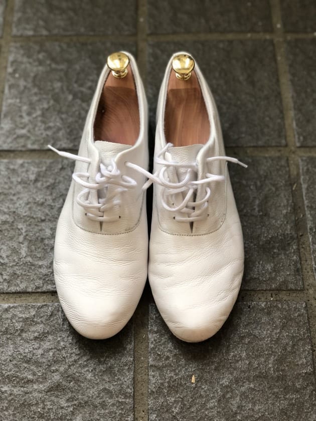 あと白い革靴は少しかっこが良すぎてキャラじゃないなと思っていたのですが、こちらならスニーカーに近い感覚で履けるかなと思い購入したシューズになります。