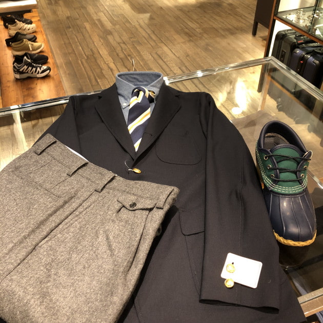 今回はシンプルな合わせですが、ネイビーブレザーなのでかなり万能です。