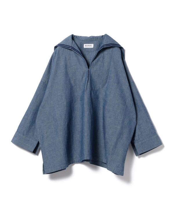 大きめのセーラーカラーがポイントのシャンブレーシャツ。デニムで有名な備後産地で生産された5オンスの綿麻シャンブレー生地を使用しています。袖口はロールアップすることで、ボタンを見せられる仕様に。ゆったりとしたサイズ感に、洗い加工を施すことで増す風合いが、春夏の雰囲気にぴったりのひと品です。