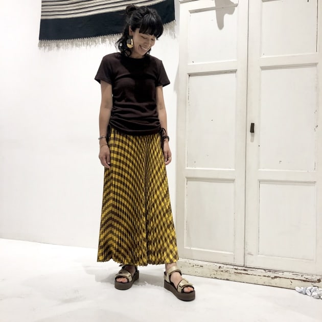 YELLOW×BROWNがとても魅力的なカラーリングのアコーディオンプリーツスカート。
