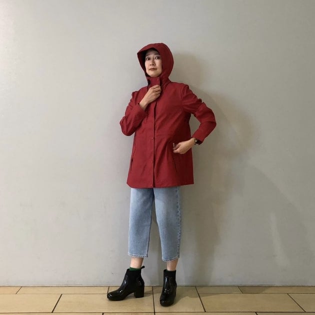 赤いアウターと、光沢感のあるシューズでとてもかっこいいコーディネートです!