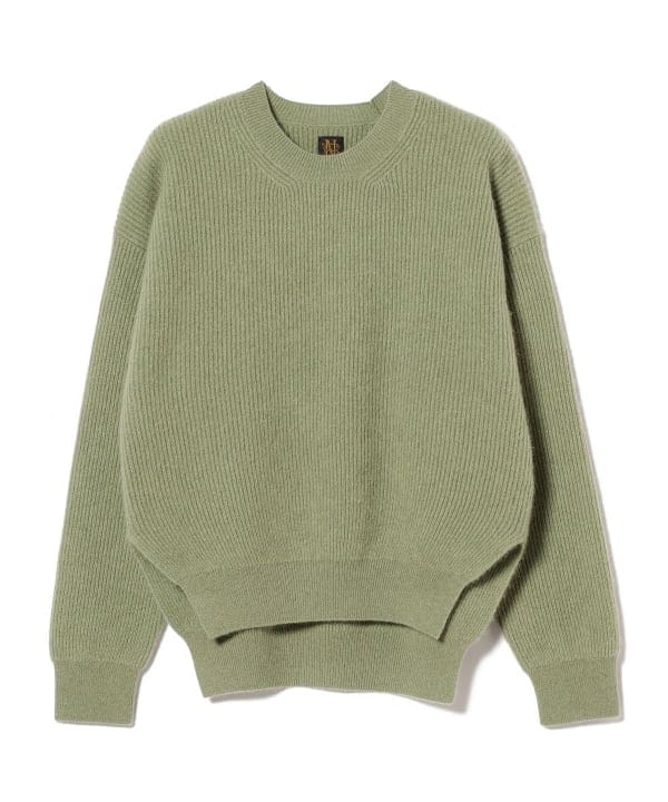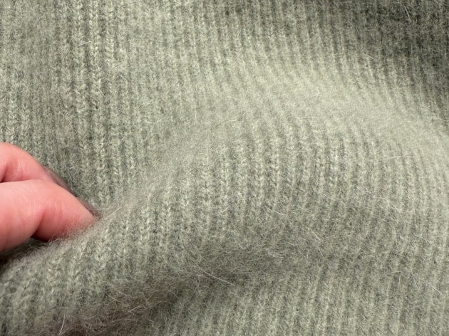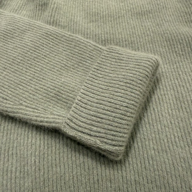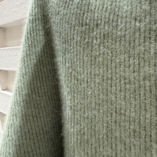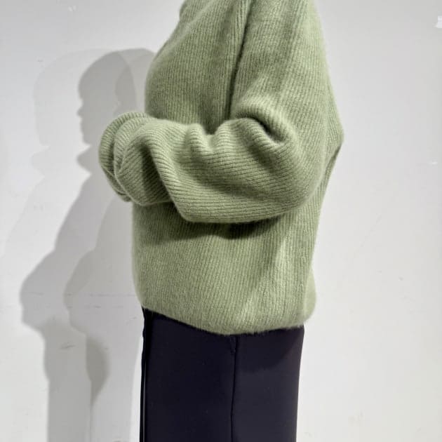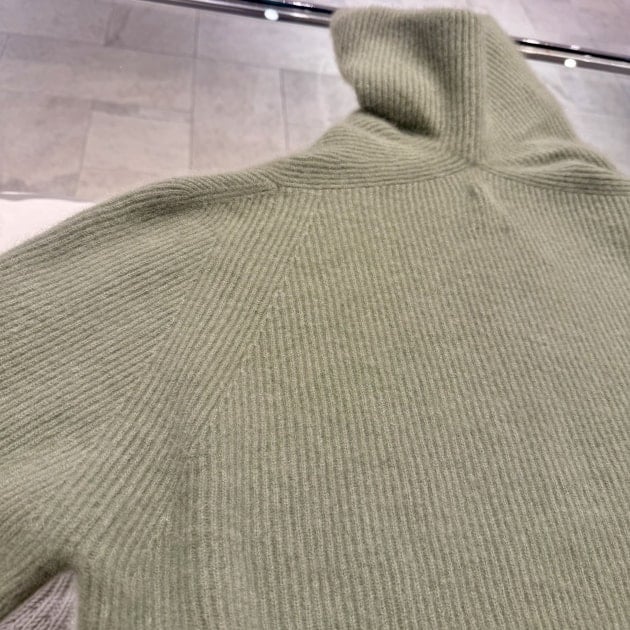 素材感はふんわり柔らかい素材を使用してますが、細かなリブ編みの縦縞により、表情感のあるメリハリのあるスッキリとした印象に。