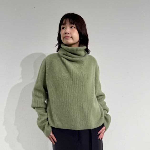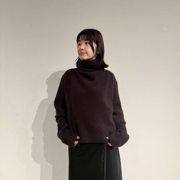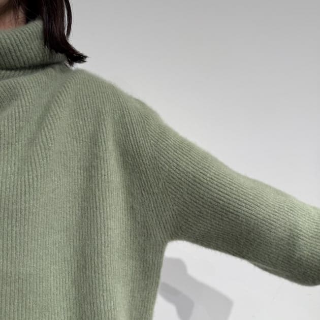 ゆったりとして長さのあるタートルネックです。ネックとボディに繋ぎ目がないので、ミニマルで優雅な印象です。