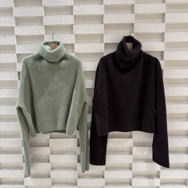 タートルネックが苦手な方には、形違いのクルーネックの展開がございます。