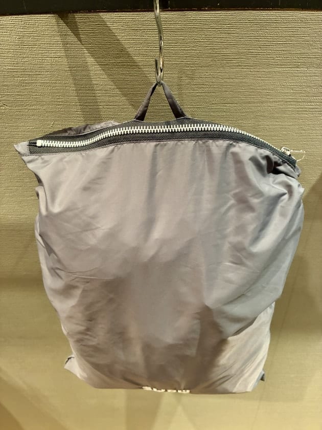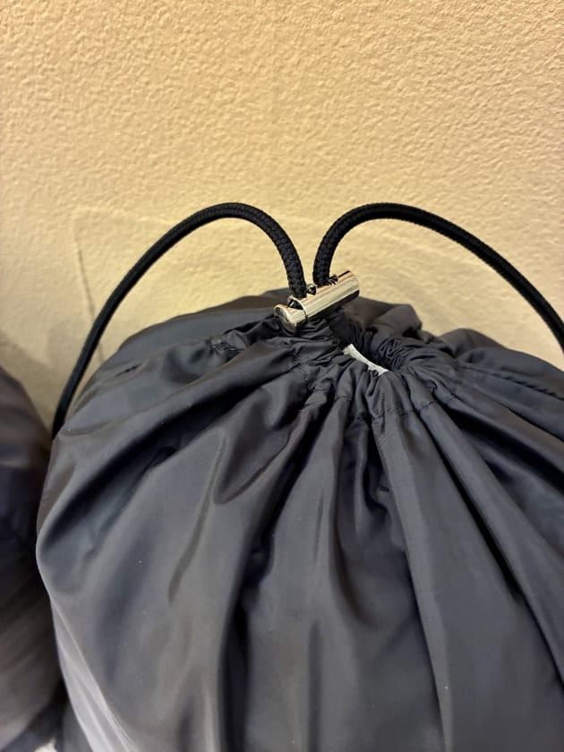 この別注の収納袋は靴のディテールに合わせて紐ではなくジップ、ドローコードを付けております!