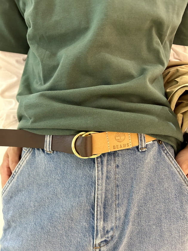 リングベルトのボリュームあるアクセントがワイドパンツに相性抜群なのと、アクセサリーとも取れるゴールドリングが、無骨なUSEDデニムの野暮ったさを程良く軽減させてくれます!