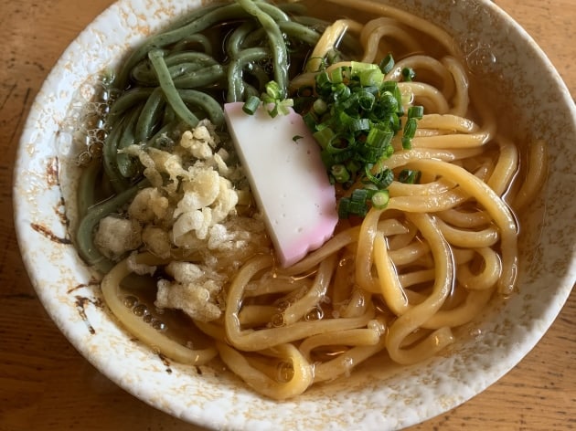 因みに、どのメニューを注文してもこのワカメ麺と、季節の野菜を練り込んだうどんが半々で出てきます。(季節の野菜はその時々で変わります。今回は、持ってきたおばちゃんの声があまりに小さく、マスクもしていたので分かりませんでした…こうなると聞き直せない笑)