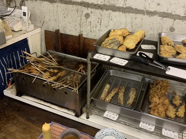 おでんや天ぷらを取って、おかみさんにうどんを注文してすぐうどんが出てきます。