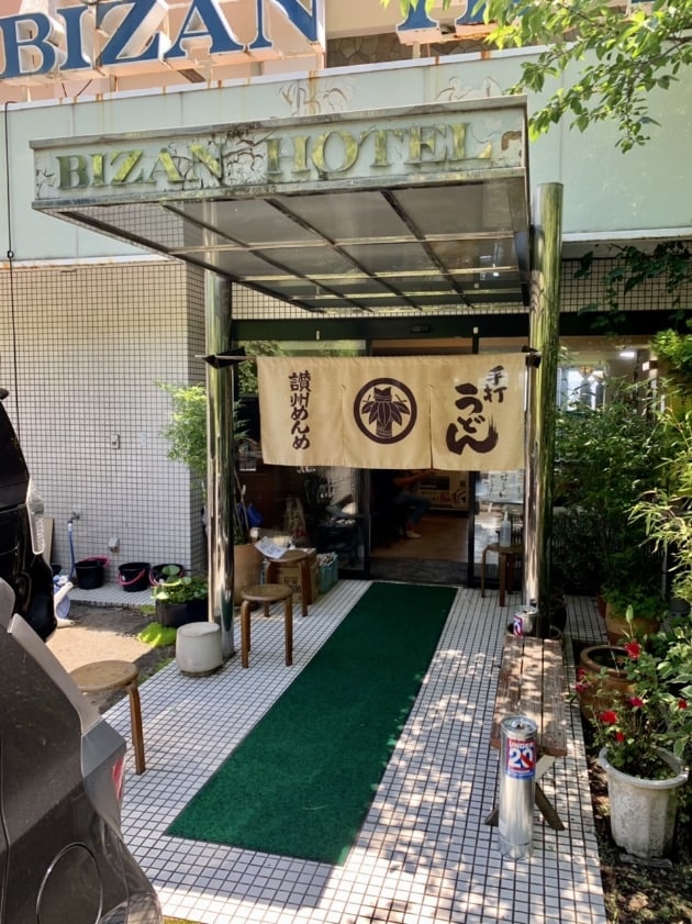 暖簾の上にBIZAN HOTELとあります。そうです、コチラ讃州めんめさんは終業したホテルの後にあるうどん屋さんです。