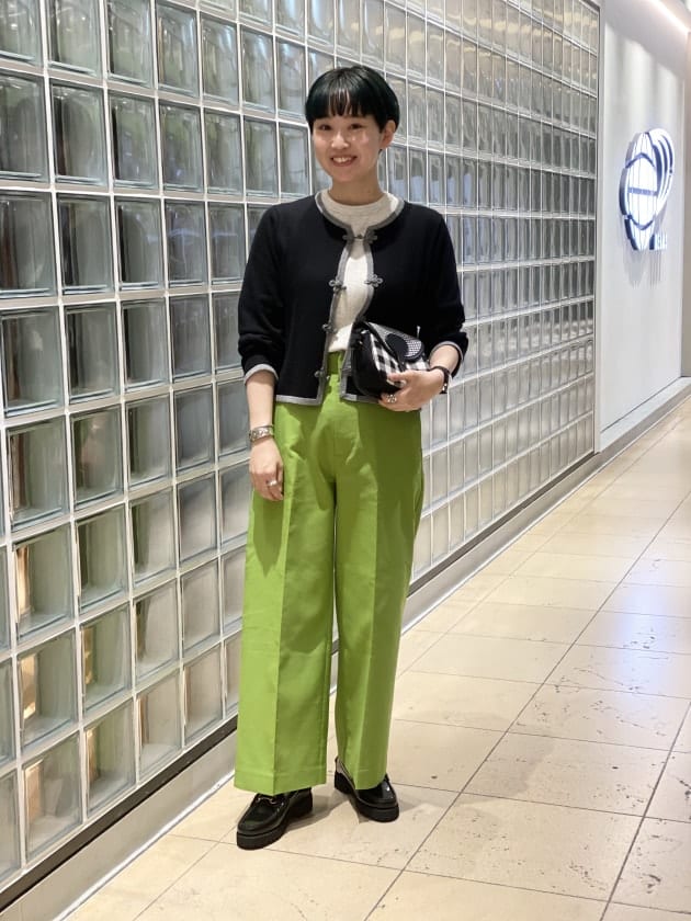パンツが派手なカラーなのでカーディガンとローファーで締め色に!!!