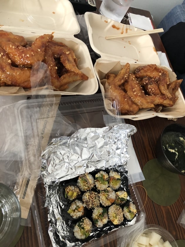 韓国料理といっても、このように、ヤンニョムチキンとキンパですが、、、