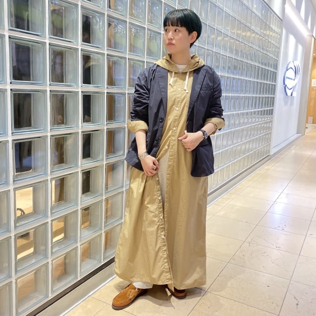 シューズ、ジャケットはカッチリした印象に中はスポーティーなフードワンピースを合わせてラフな感じに!!