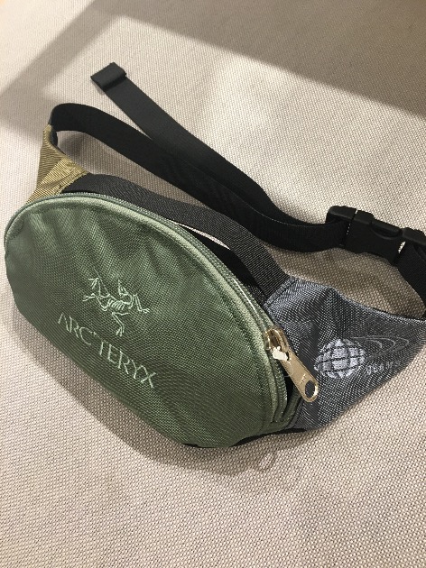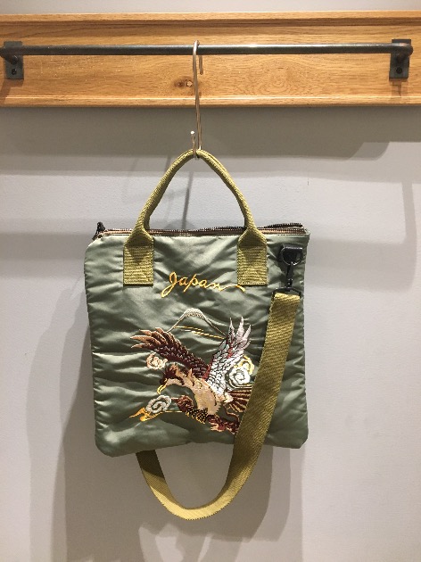 ミリタリーアイテムのヘルメットバッグをベースに、鷲と富士山という人気モチーフのスカ刺繍を横振りミシンで施しています。