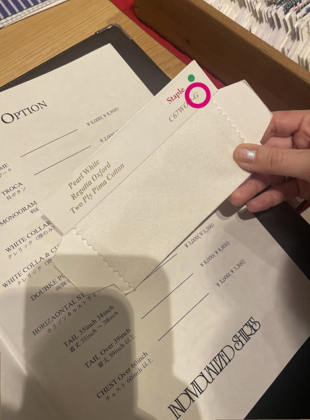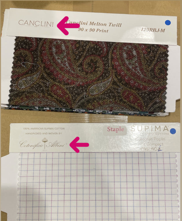 左に生地メーカーの名前も記されています。こちらの二生地はビームスのメンズドレスレーベルでも使われている生地メーカーのものらしいです。そちらを河原のオススメとして紹介させて頂きます。
