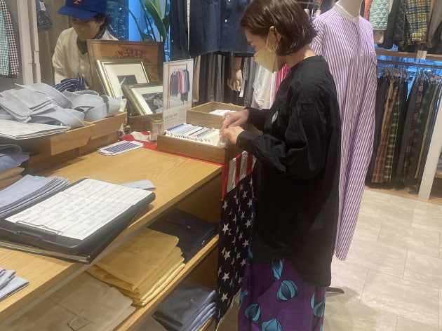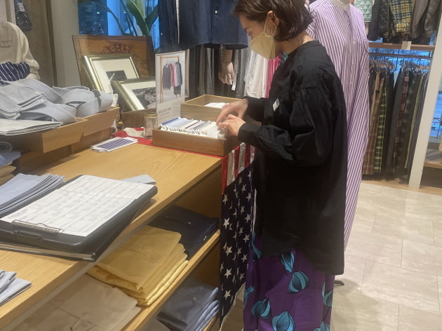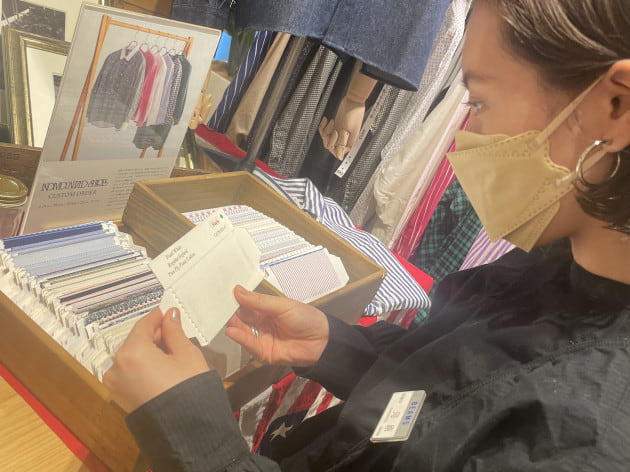 ①まずは店頭に用意してあるたくさんのサンプルの中から自分のイメージするアイテムを試着する!そこから微調整(少し丈を長くするなど)!