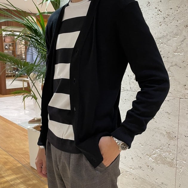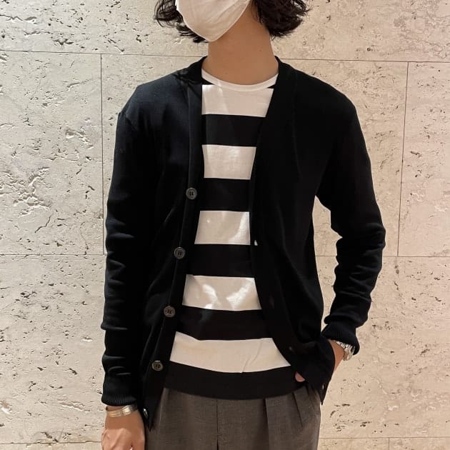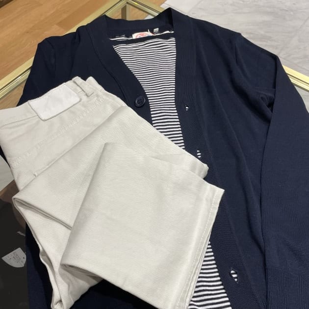 良質なコットンニットのカーディガン、一着あると便利ですよ!