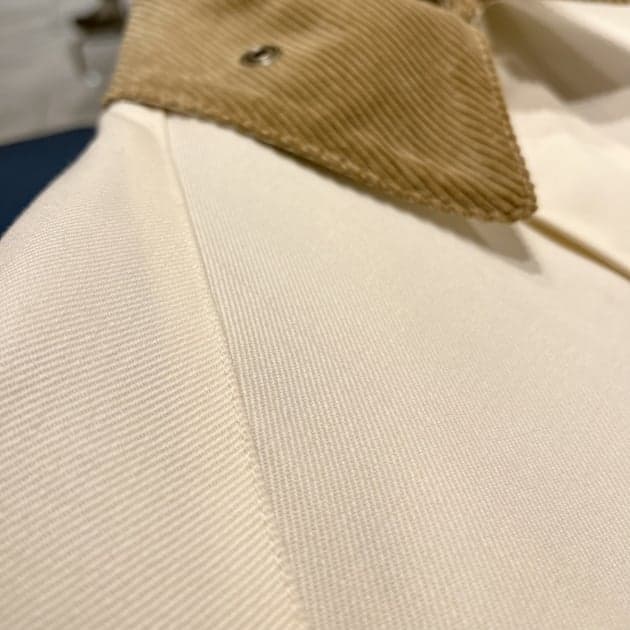 オフホワイトという色がラギッドさを中和し、襟はボディーとのバランスを考えてベージュにする事で上品な見た目に仕上がっています。