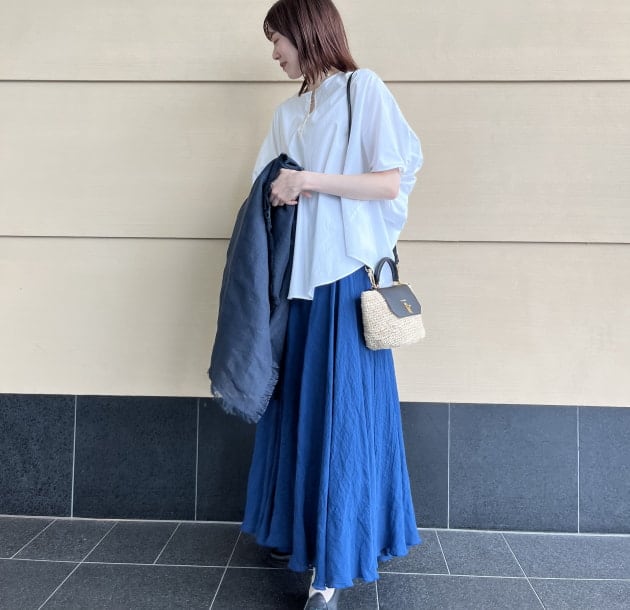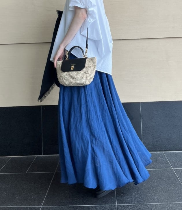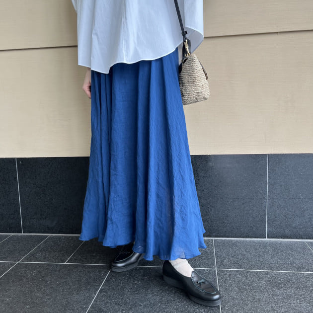 鮮やかなブルーカラーがきれいな〈AK +1〉のマキシスカート