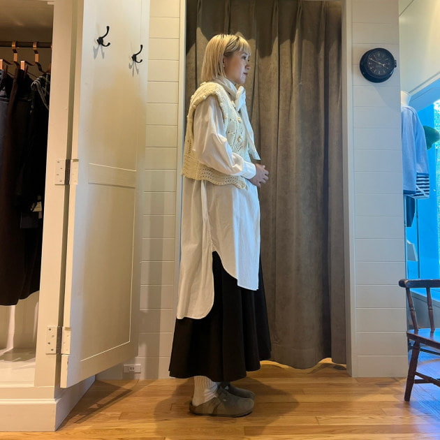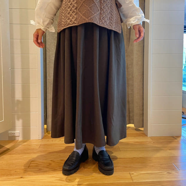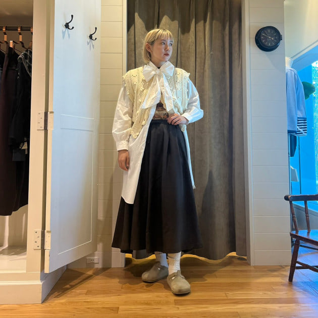 今週は、〈GRAMICCI〉別注ギャザースカートを着回し!たっぷりのギャザーなのに軽い素材にこだわり、重たくないのが嬉しいポイント!軽やかな動きのあるスカートで、身長153cmの私が履いても足首の見える、履きやすい丈感です!コーディネートは、スカートがAラインシルエットで女性らしさのあるアイテムなので、あえてワークベストを合わせて、甘くならないようにバランスをとりました。