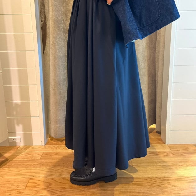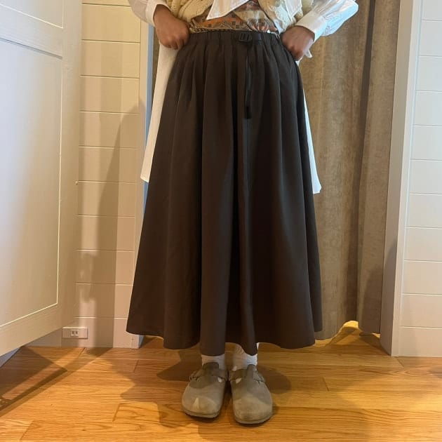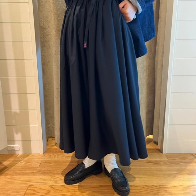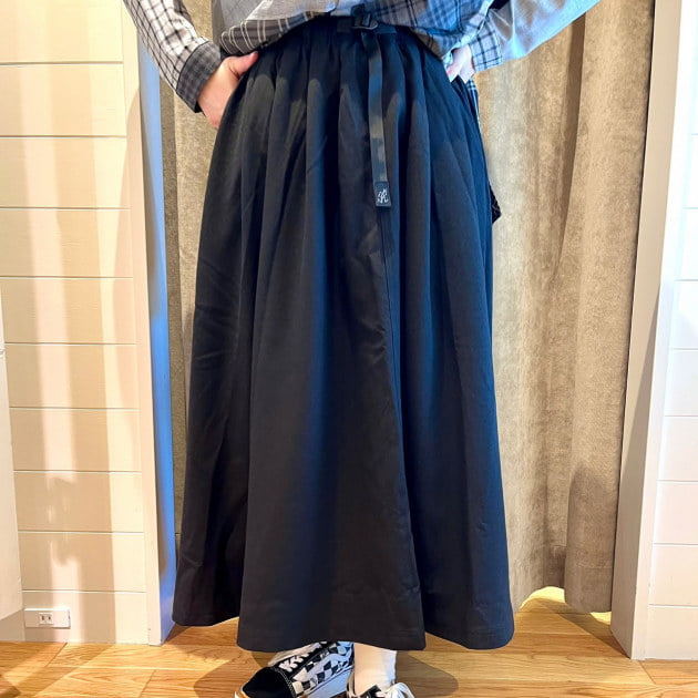 今週はグラミチ別注のスカートを着回していきます!毎年人気のこちらは冬バージョンはラナテックレイという素材を採用しています!こちらはポリエステル100%なので、ガシガシお洗濯していただけ、軽量なのに、ウールのような見た目や光沢感があるものになっています!丈は少し短めで、スカート自体にボリュームがありますが、すっきりした印象になります!大活躍なスカートですよ〜♪