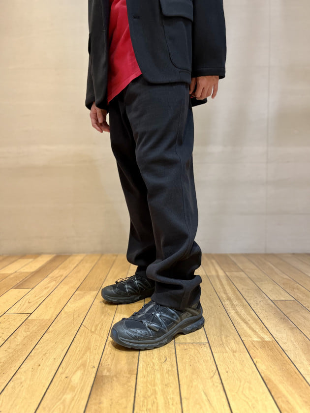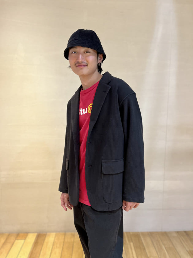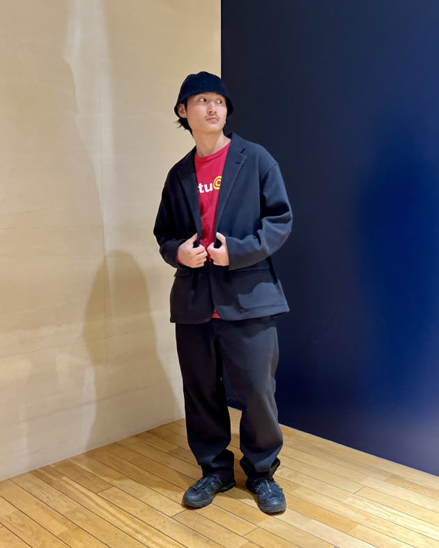 普段着用する機会が少ないセットアップでのスタイリング。セットアップだと固くなりすぎて見えるので、インナーのロンTは赤を。シューズはSALOMONでバランスをとることを意識しました。