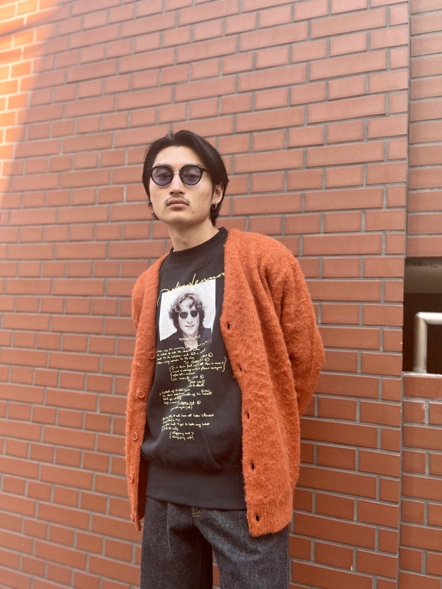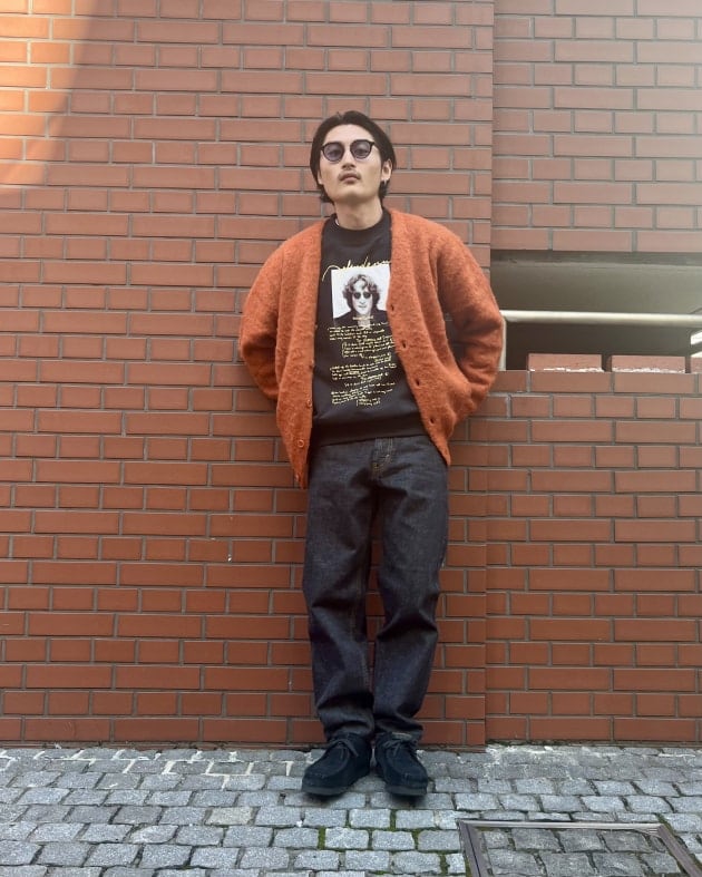 目を惹くオレンジのカーディガンをメインに。インナーにはジョンレノンのスウェットをチラ見せ。パンツはデニムをチョイスし、男らしいカジュアルなスタイリングを意識しました。