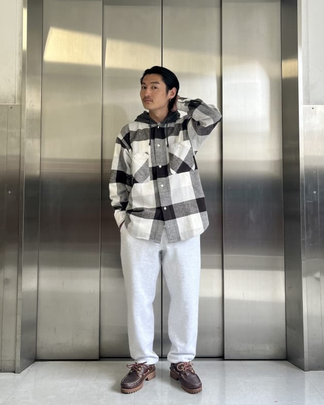 フード付きのネルシャツをメインにスタイリング。楽な格好を意識して、パンツはスウェットパンツをチョイス。足元は、ラフになりすぎないよう、timberlandの3eyeで引き締めました。