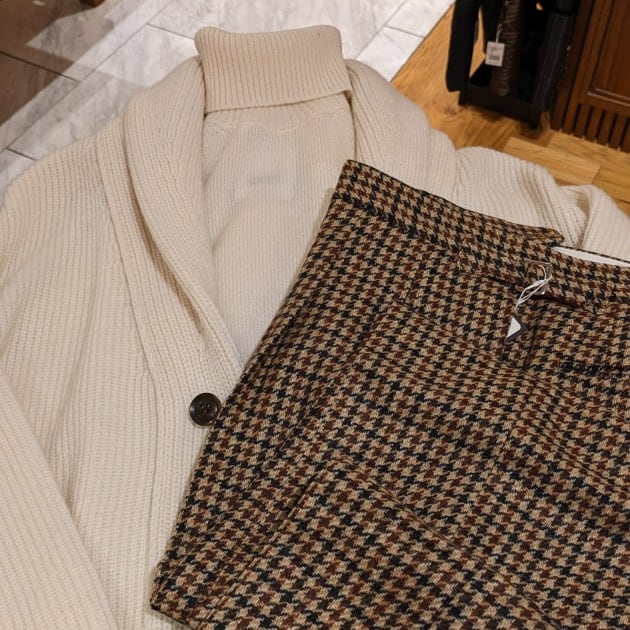 いつもグレー無地のパンツを履くコーディネートをこのパンツに代えるだけで、生地の表情が出てグッと洒落て見えますよ!