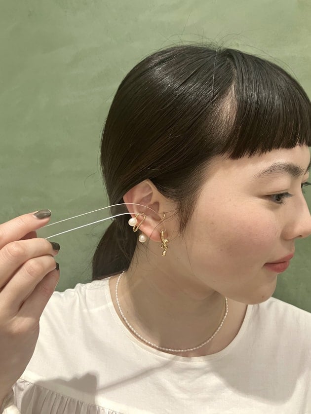 パールのイヤカフのレイヤード。