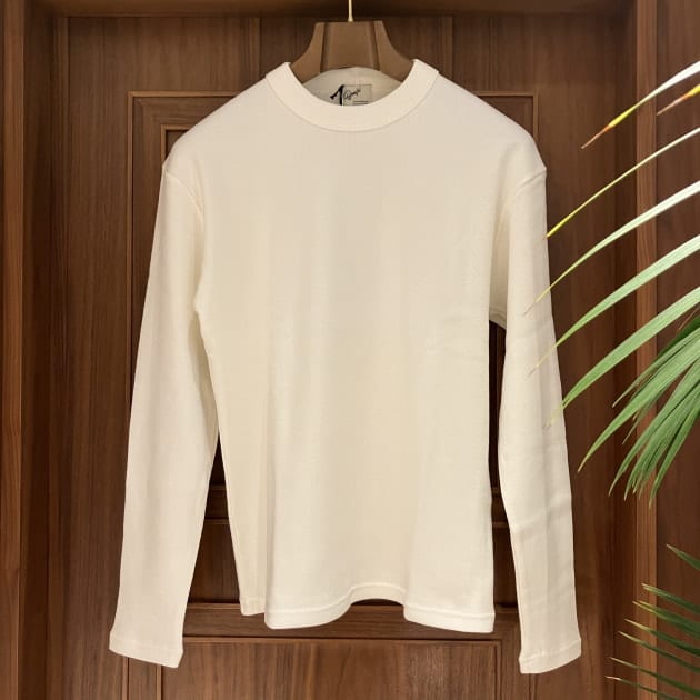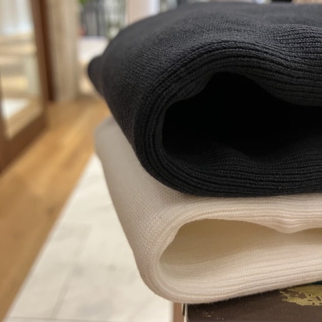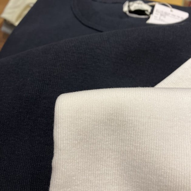 縦にウネの入る伸縮性のある生地で、かなりの度詰めに編まれており、一般的な物と比べると良い意味で重量を感じます。