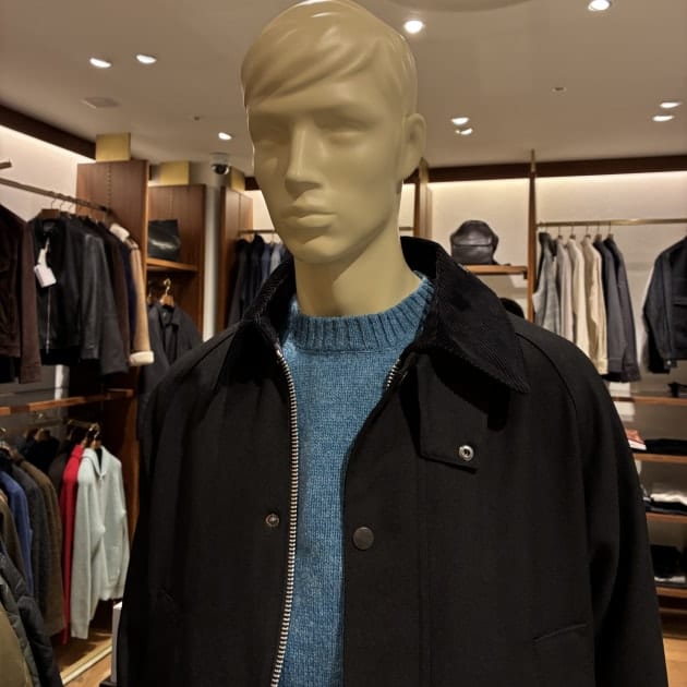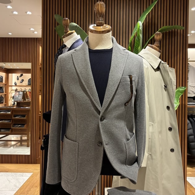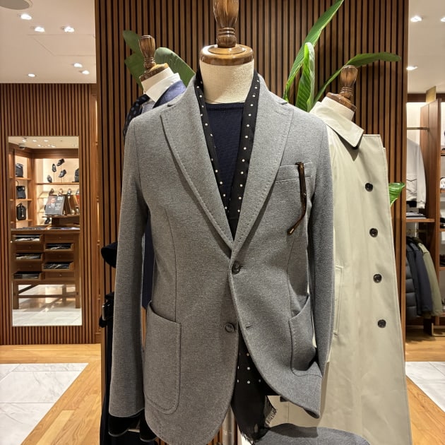 <CIRCOLO1901>のイージージャケットにシルク混のニット。カジュアルな印象の合わせにストールを巻くと落ち着いていて、エレガントな印象になります。