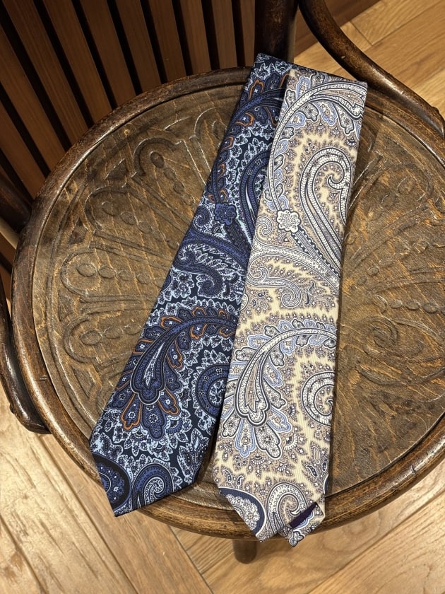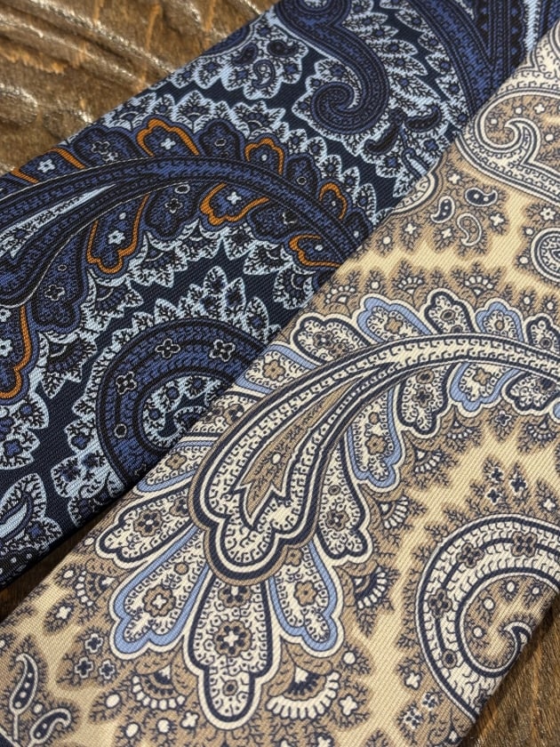 ストライプ以外の柄も入荷しています。こちらはペイズリー柄のプリントタイ。一見すると大柄のペイズリーですが、