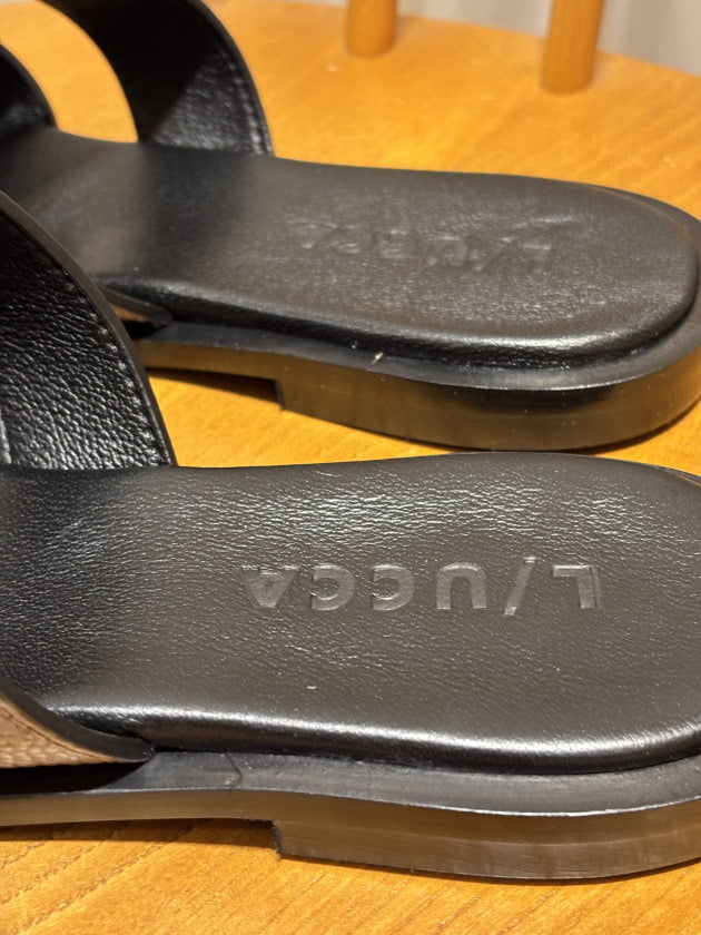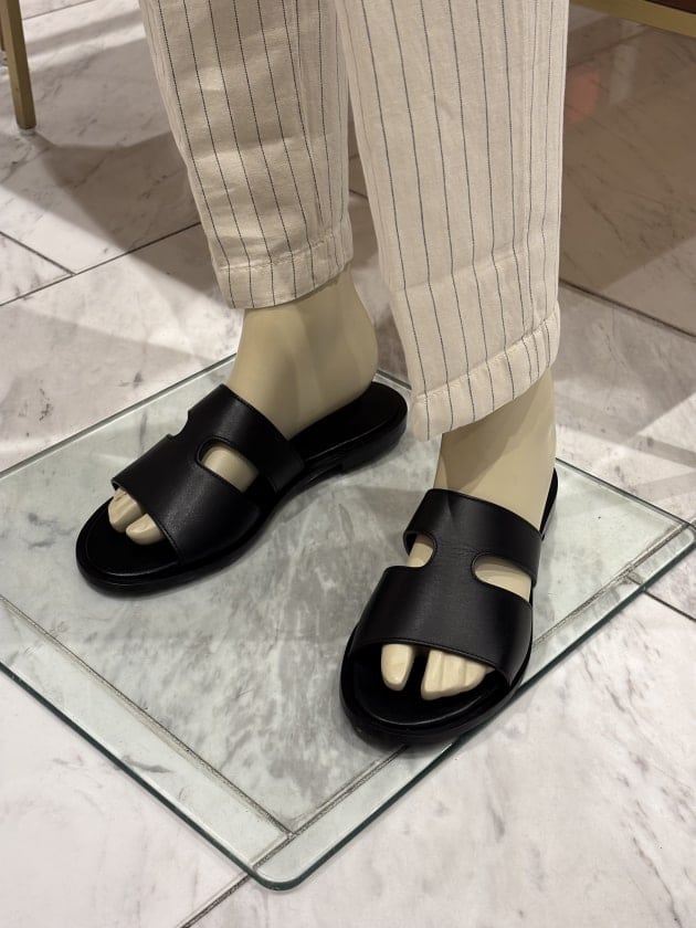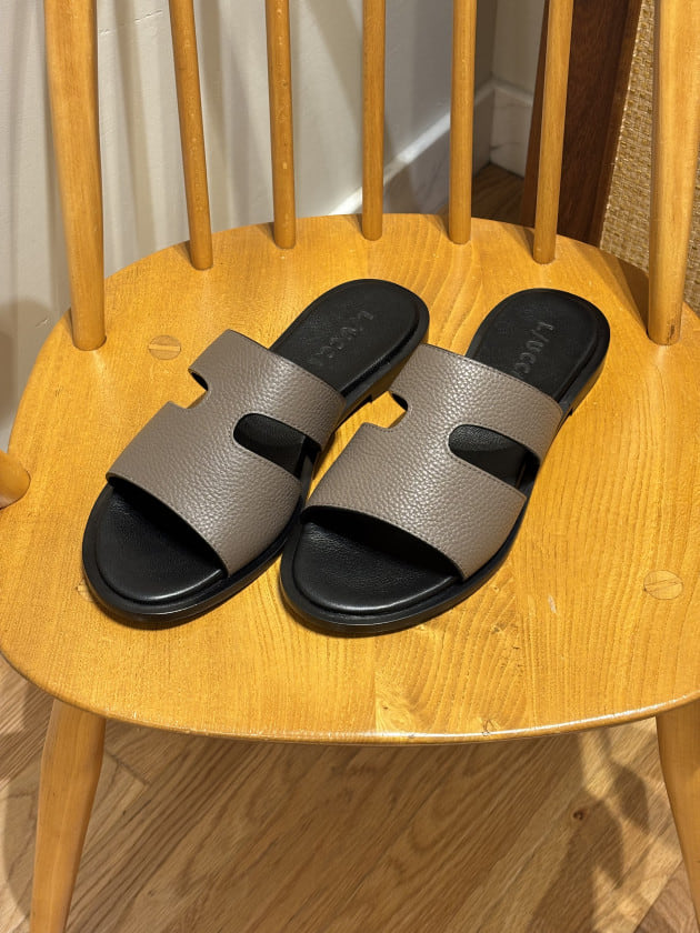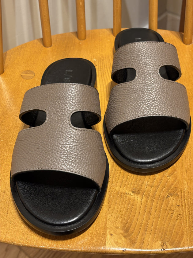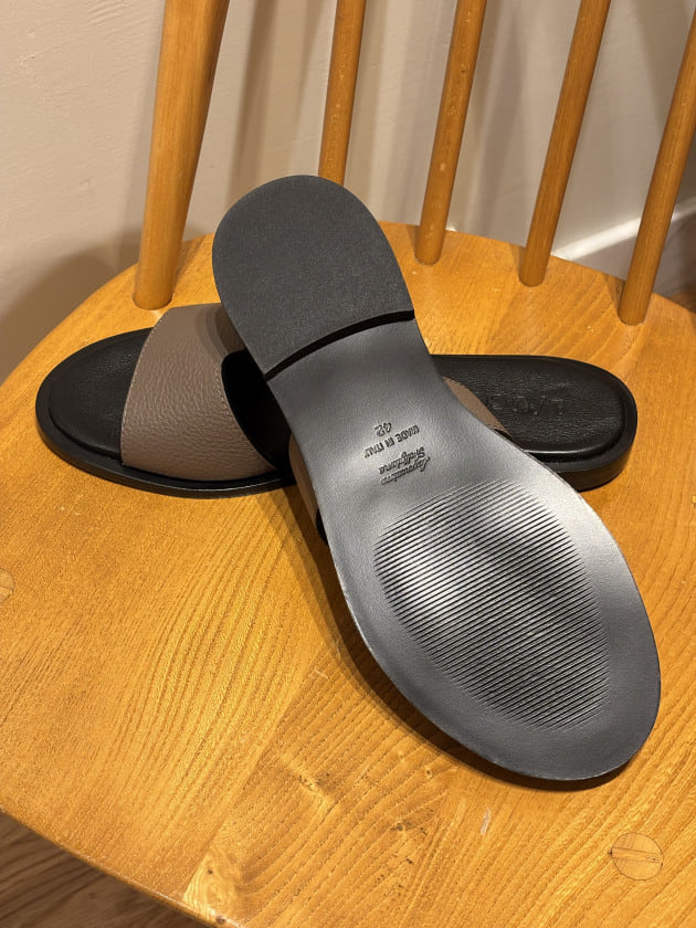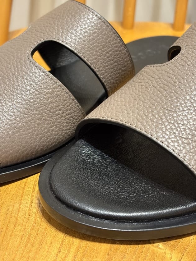 グレージュのような発色ですね。BLACKカラーとのコントラスト、相性も良く、モダンな雰囲気のレザーサンダルに仕上がっております。